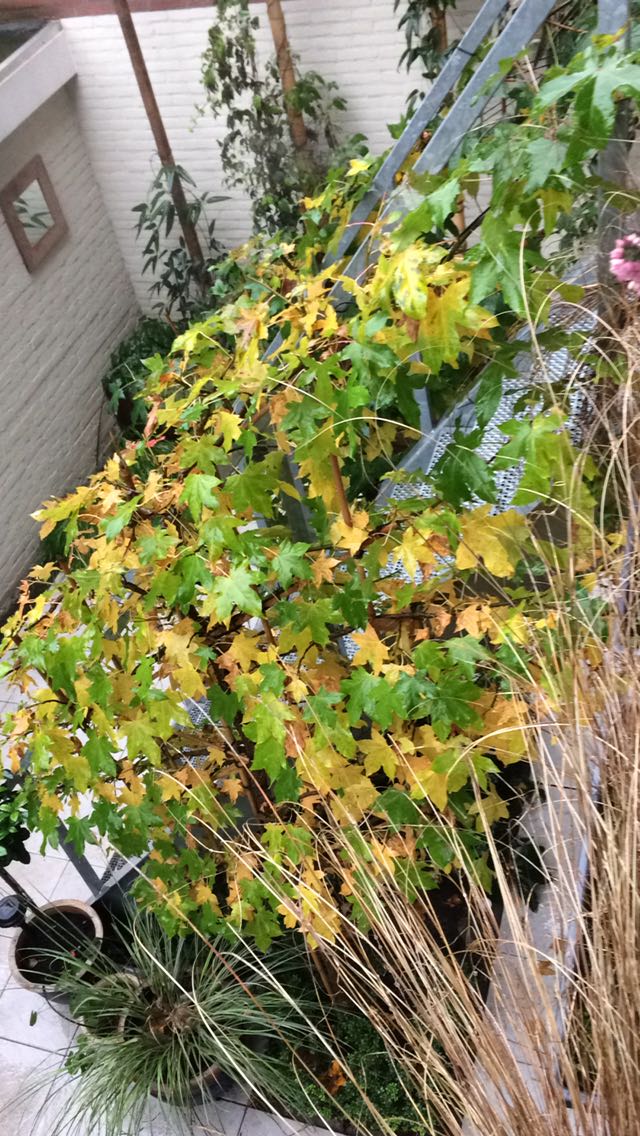 Twee aangepaste leibomen bekleden de trap, een groene klim naar de 1e etage